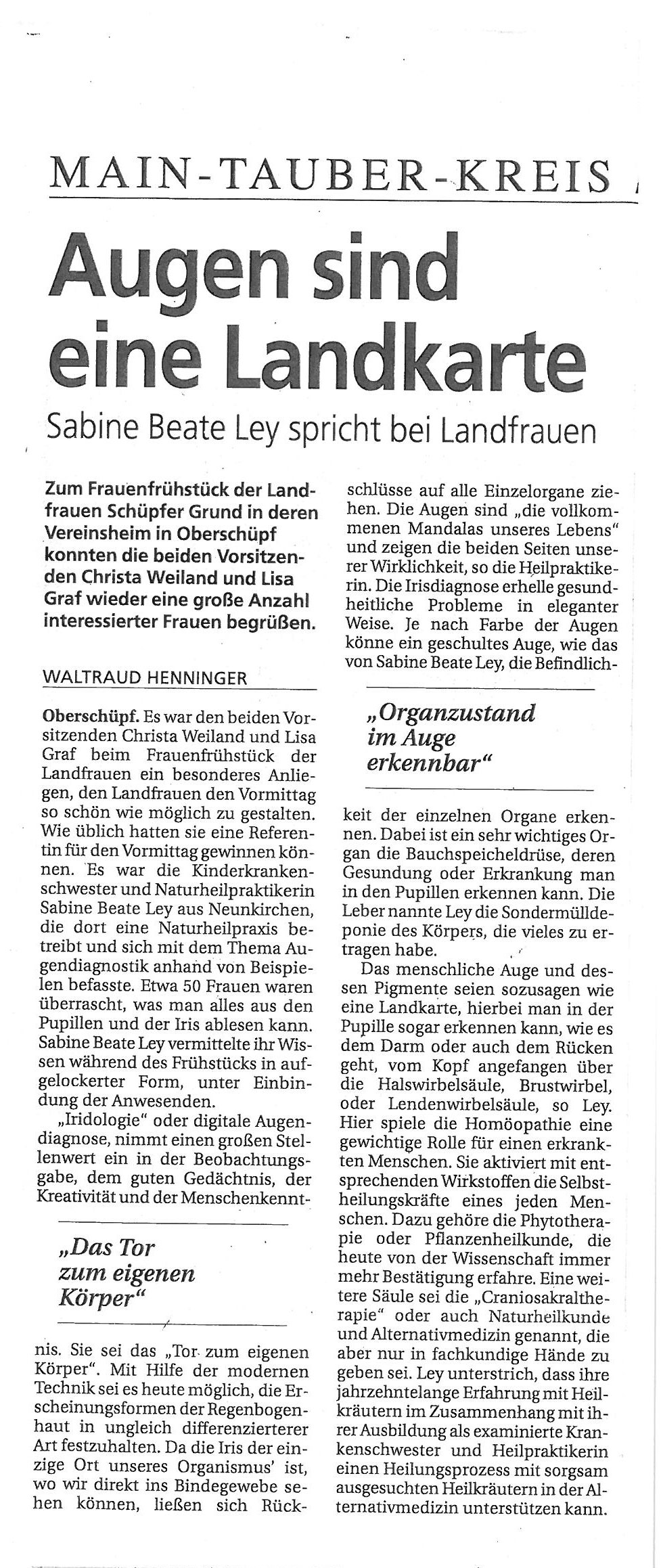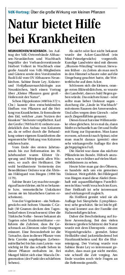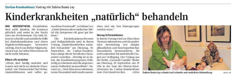 „Homöopathie und Kräuterheilkunde sind die Schwerpunkte von Sabine Beate Ley. Die examinierte Kinderkrankenschwester zeigte schon als Kind großes Interesse an Pflanzen, Tieren und der Natur. 2001 begann sie ihr Intensivstudium zur Heilpraktikerin, ein Jahr später eine Homöopathieausbildung. Ihre Heilpraktikerprüfung legte Sabine Beate Ley im Januar 2006 ab. Eine Assistenzzeit in der Naturheilpraxis von Wolfgang Spohrer in Bad Rappenau schloss sich an. Sie war an verschiedenen Heilpraktiker-Schulen tätig und unterrichtet seit 2007 Kinderheilkunde, Homöopathie und Phytotherapie (Kräuterheilkunde) an der Schule für Klassische/Systemische Homöopathie im Kloster Bronnbach. Mit einer Ausbildung in Craniosakraler Osteopathie in der Sportschule Waldenburg rundete sie 2006 bis 2008 ihr Wissen ab. Hauptschwerpunkt ihrer Tätigkeit als Heilpraktikerin wird die Homöopathie sein. Hier, so Sabine Beate Ley, „möchte ich die Menschen in ihrer Gesamtheit behandeln und nicht einfach ihre Krankheiten“. Schließlich hätten „Krankheiten, die sich auf körperlicher Ebene manifestieren, grundsätzlich auch eine Ursache im seelischen Bereich“. Dies gelte insbesondere ach für die typischen chronischen Krankheiten unserer Zeit wie Rheuma, Diabetes, Asthma, Bluthochdruck oder sogar Krebserkrankungen.